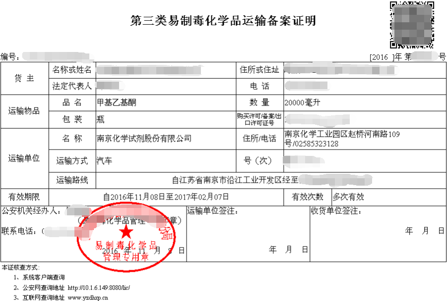 易制毒化學品運輸備案證明樣圖