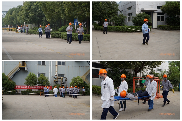 7月18日下午,公司組織了安全、消防、環保綜合預案演練。15時許,原料罐區模擬“甲苯儲罐底閥連接軟管斷裂發生泄漏”,接生產分廠和門衛總值班報告后,應急救援領導小組總指揮宣布啟動應急預案。各應急救援小組接到通知后,緊急趕赴事故現場。警戒疏散組現場進行了隔離疏散;后勤保障組及時將搶險物資送至現場;醫療救護組對“中毒人員”進行救治并送往醫院;應急搶修組對泄露的“甲苯”進行吸附、空氣稀釋、回收等應急處理,并對斷裂軟管展開搶修;污染控制組關閉公司對外雨污排總閥,開啟事故池閥門,及時封堵現場雨水口,并對現場泄漏物進行檢測監控。至15時45分許,總指揮宣布解除警戒,演練結束。