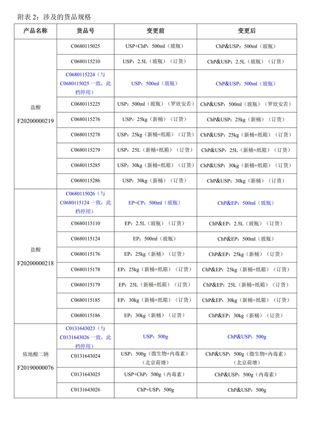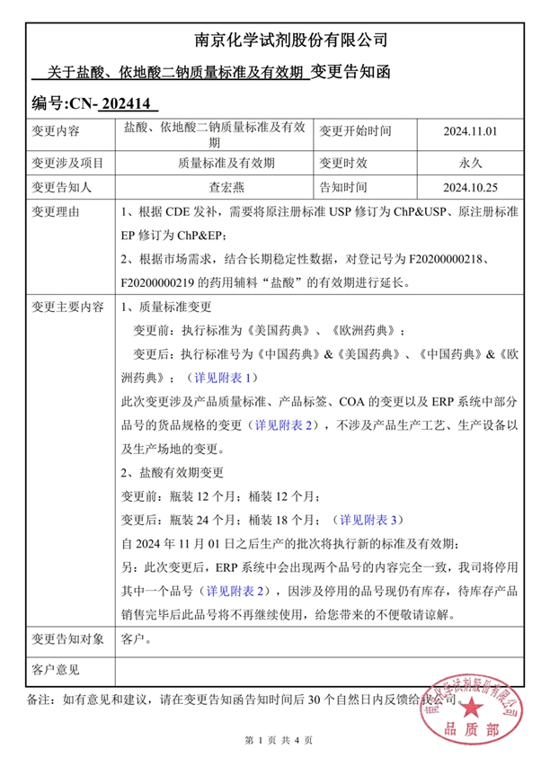 11月1日起,南試鹽酸(USP)/(EP)、依地酸二鈉(USP)質量標準變更,鹽酸(USP)/(EP)有效期變更,變更告知函如下!