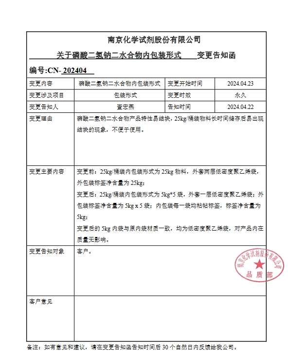 南京化學試劑股份有限公司:關(guān)于磷酸二氫鈉二水合物內(nèi)包裝形式變更告知函編號:CN- 202404變更內(nèi)容:磷酸二氫鈉二水合物內(nèi)包裝形式變更開始時間:2024.04.23變更時效:永久