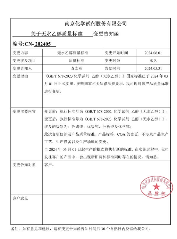南京化學試劑股份有限公司,6.1號起,對于無水乙醇質量標準進行變更,詳情如下: