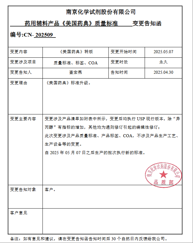 藥用輔料產(chǎn)品《美國(guó)藥典》質(zhì)量標(biāo)準(zhǔn)變更告知函: