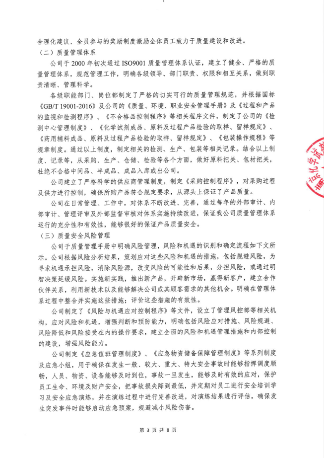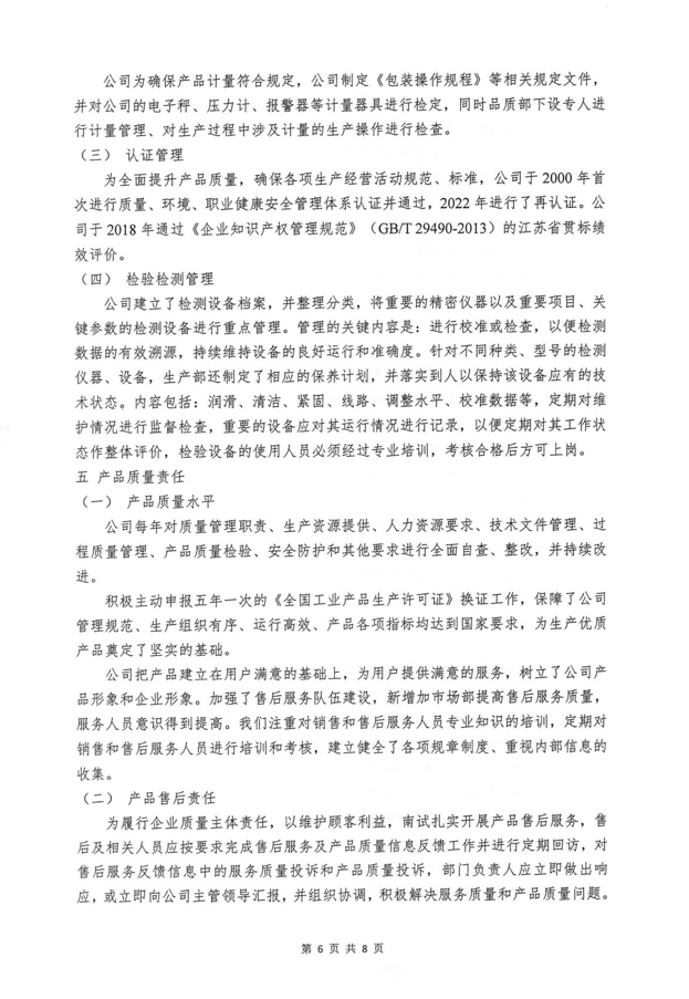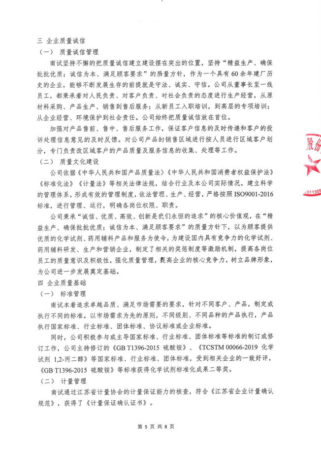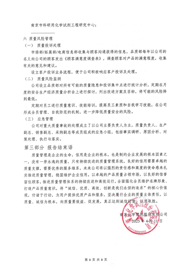 《南京化學試劑股份有限公司質量信用報告》回顧了南京化學試劑在質量管理、產品質量責任、質量誠信管理等方面的方針、制度、措施及取得的成效。關于報告的內容,說明如下: