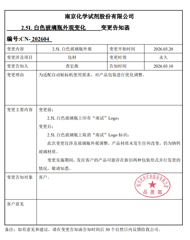 為了適配自動灌裝機自動貼標(biāo),將取消2.5L白色玻璃瓶上的“南試”logo,包裝瓶的材質(zhì)已經(jīng)供應(yīng)商均未發(fā)生變化,對產(chǎn)品內(nèi)在質(zhì)量無影響。庫存剩余包裝瓶使用結(jié)束后將啟用新的包裝瓶;